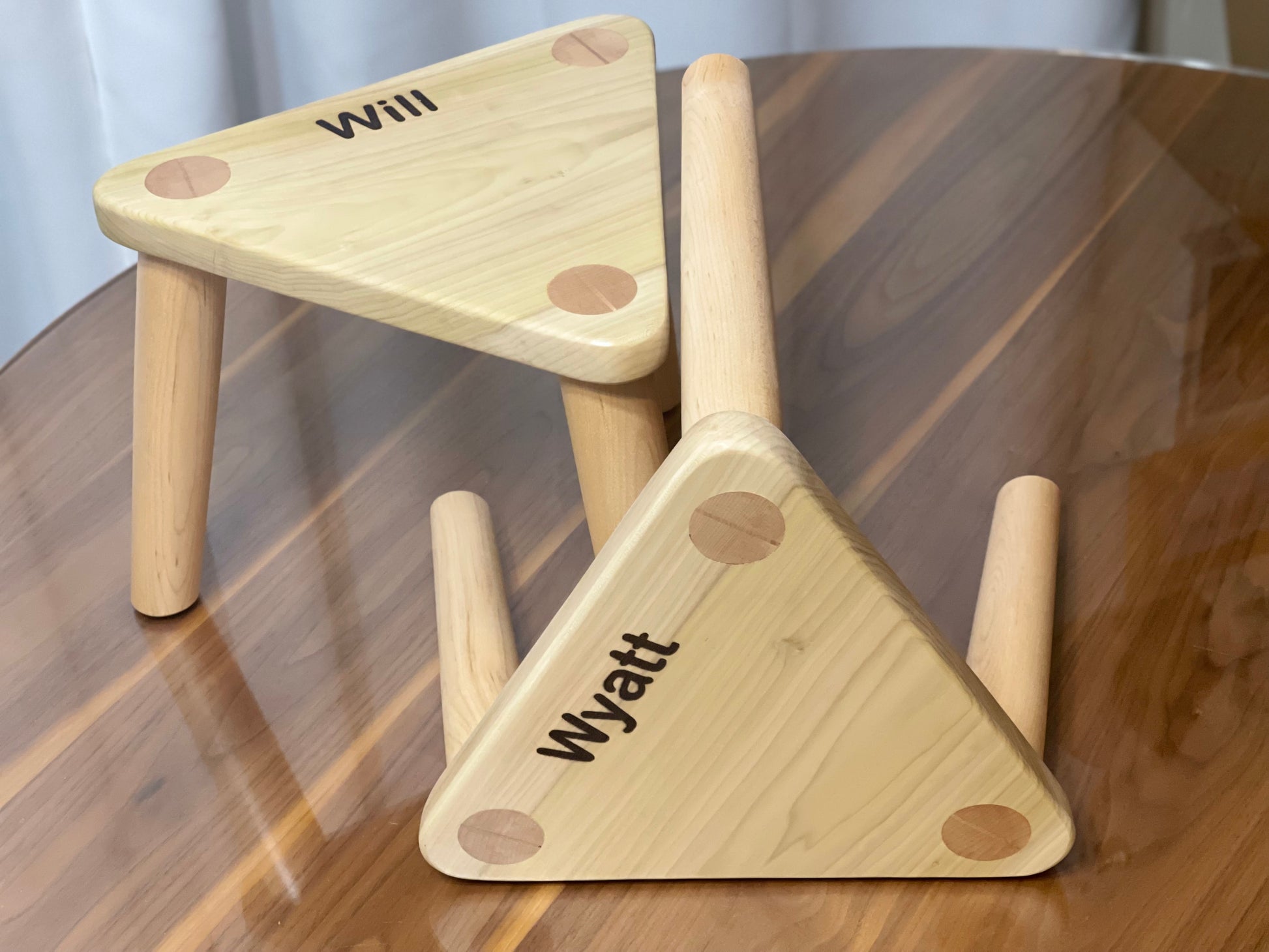 Handcrafted hardwood stool is perfected for the little ones to sit securely without tipping. The triangle seat design is ideal for little ones to grasp & carry and provides stacking storage capabilities. The angled legs aid in the stability of this stool.