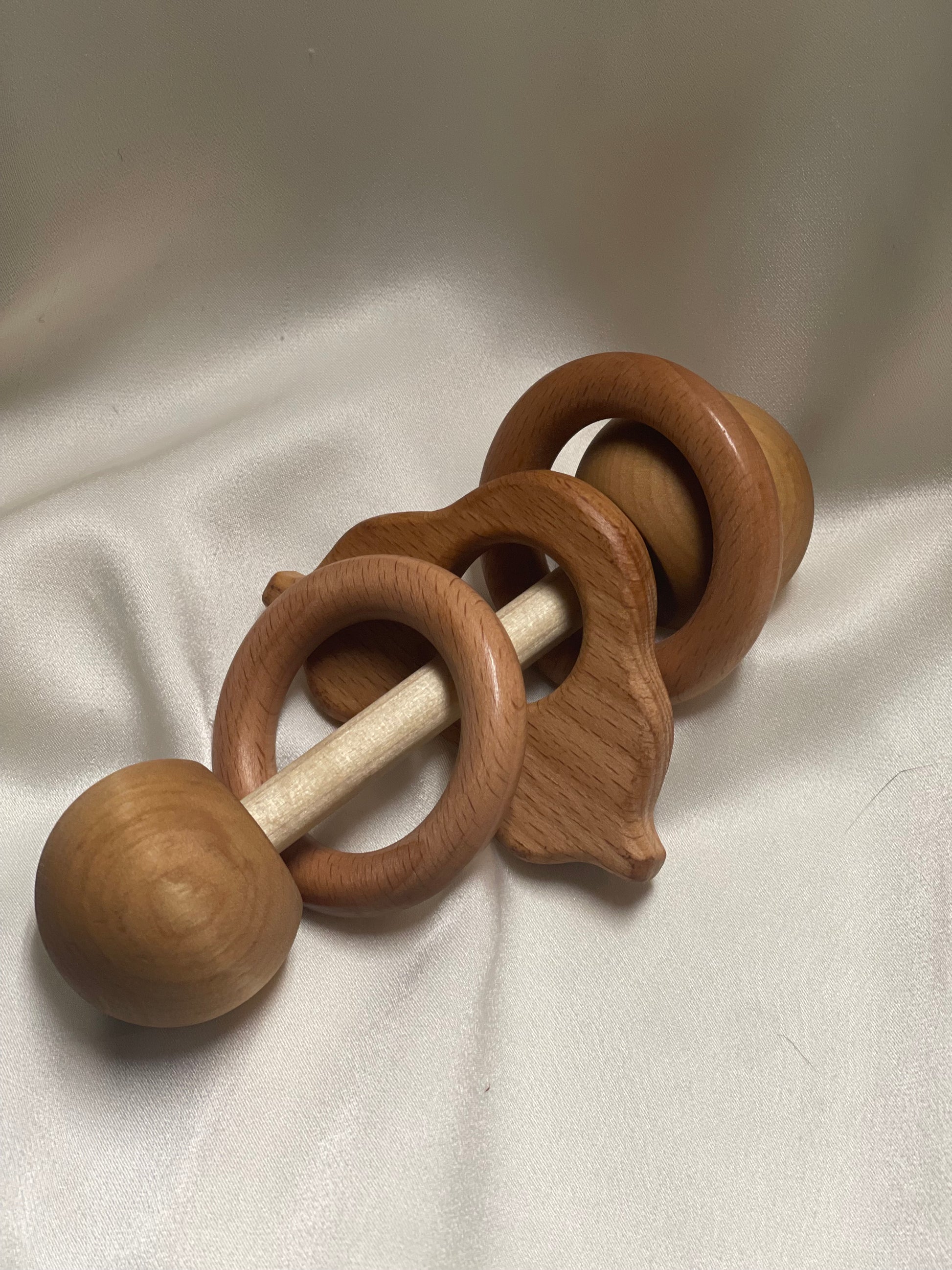 This handcrafted wooden rattle, featuring a car beechwood teether in center with two rings. It is sealed with a protective layer of olive and coconut oil is perfect for parents in search of a tasteful and stimulating sensory play.